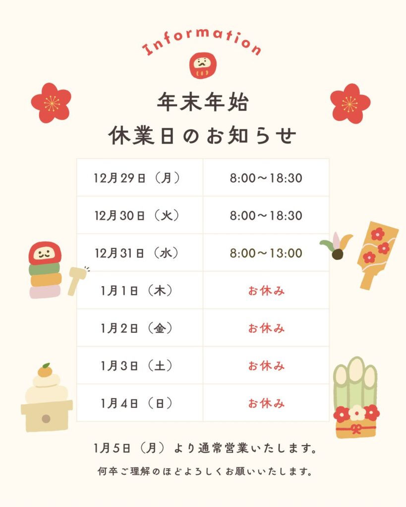 コンテンツ CONTENTS TOPコンテンツスタッフブログ年末年始の営業のお知らせ 2025/12/27 年末年始の営業のお知らせ スタッフブログ 本年も多くの皆様にご愛顧賜り、心より感謝申し上げます。 坂野生花店の年末営業に関しましては、 12月28日(日) 8:00~18:30 12月29日(月) 8:00~18:30 12月30日(火) 8:00~18:30 12月31日(水) 8:00~18:30 1月1日~4日 休業 とさせていただきます。 1月5日より通常営業とさせていただきます。 よろしくお願いいたします。 一覧へ戻る